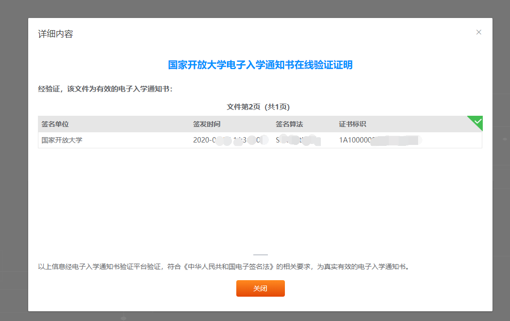 可信电子证照是具有电子签章的PDF版电子文件。2019年4月《国务院关于在线政务服务的若干规定》进一步明确电子签名、电子印章、电子证照等所具有的法律效力。此次签发的电子入学通知书是学校启动的第一类电子证照业务,采用了国密算法和国际加密算法相结合的双重数字签名,不仅有力保证了文件的可信度和不可篡改性,而且使得文件具有更强的安全性和自主性。学生可通过Adobe阅读器打开电子入学通知书,点击“国家开放大学”印章,获得文件签名验证状态,查询数字证书的签名属性、签发时间等信息。学生也可访问“国家开放大学阳光招生服务平台”(http://sun.zs.ouchn.edu.cn/),在线验证证书真伪。