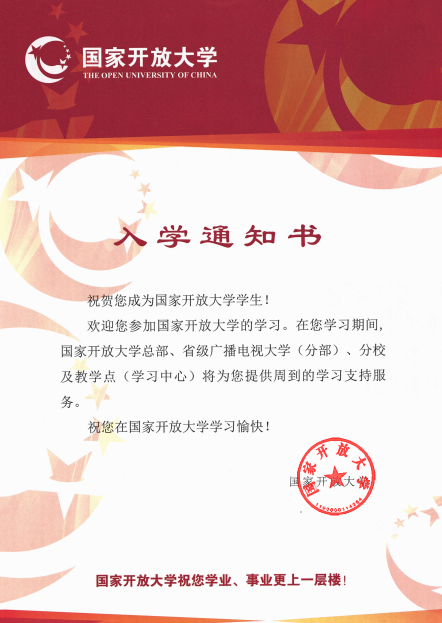 近日,国家开放大学江苏分部淮安市广播电视大学行政管理专业2020年春季某新生访问系统完成电子入学通知书下载,这意味着国家开放大学第一张可信电子证照、第一张电子入学通知书完成签发。