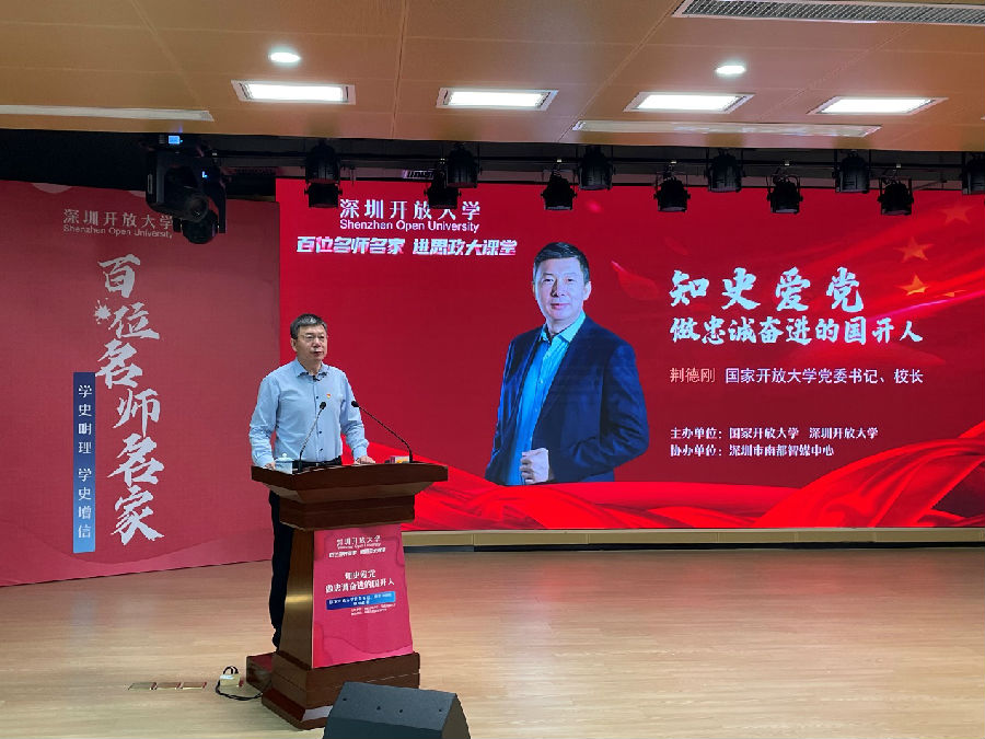 为深入学习贯彻习近平总书记在党史学习教育动员大会上的重要讲话精神,贯彻落实教育部党组党史学习教育部署要求,落实“一线规则”,2021年3月20日下午,国家开放大学党委书记、校长荆德刚在深圳开放大学通过视频直播方式向开放大学全体系师生主讲题为《知史爱党,做忠诚奋进的国开人》的思政课(点击回看),号召全体国开人从党的百年历史中汲取力量,做忠诚奋进的国开人。本次思政课在国家开放大学云教室、深圳开放大学云直播、国开在线快手号、国开在线bilibili站、国开在线腾讯直播等各平台同步播出,共计47万人观看。