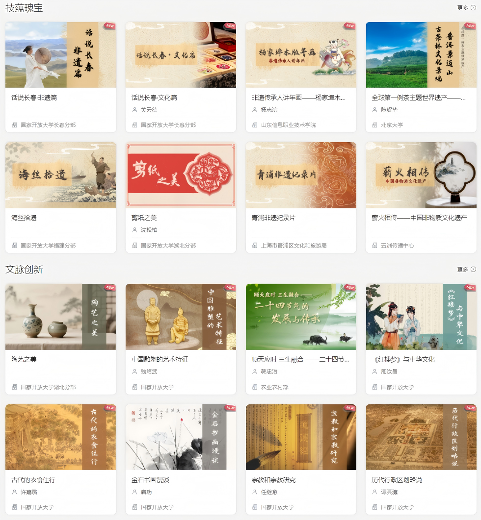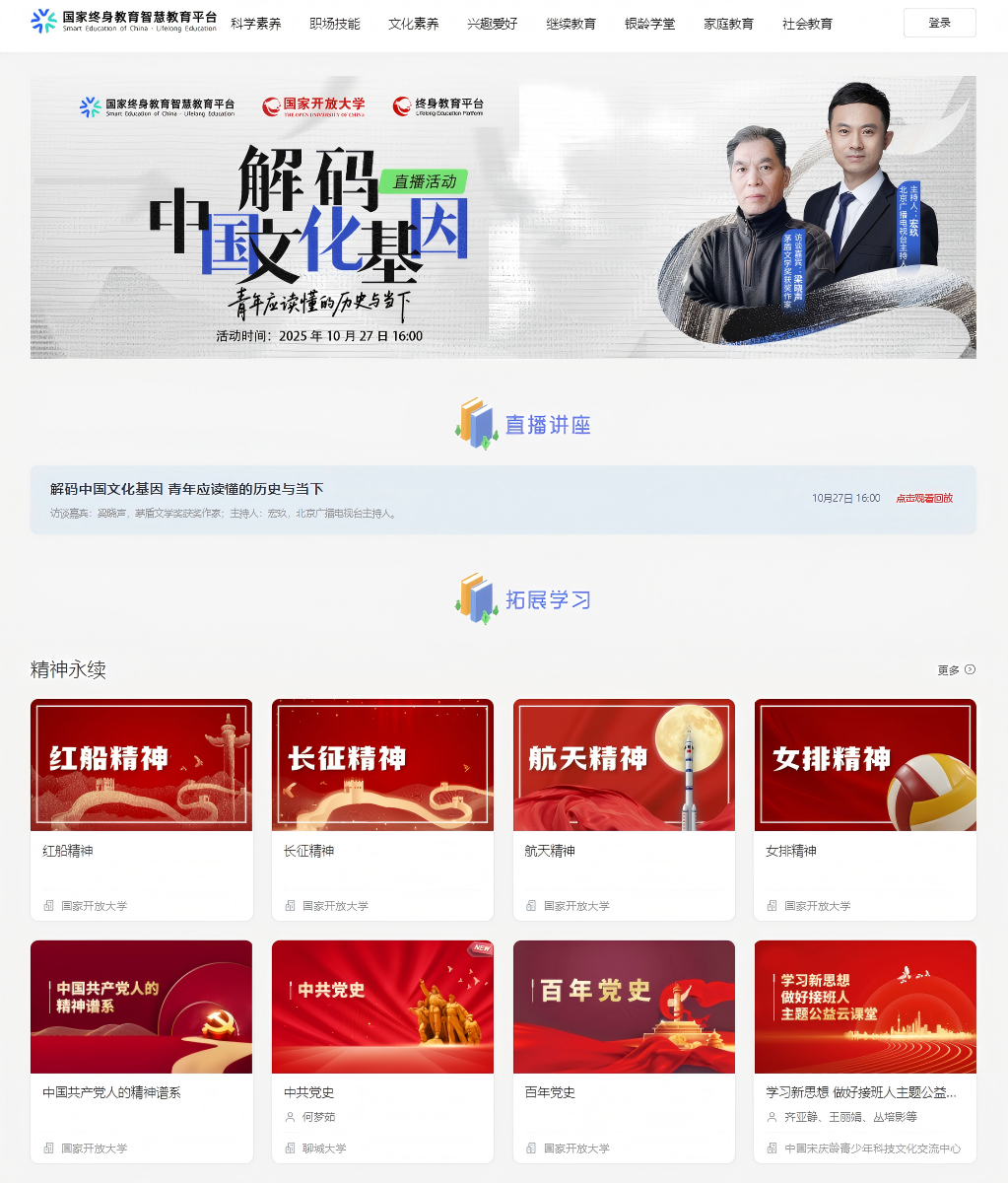 为深化和拓展活动影响力,国家终身教育智慧教育平台特别打造“解码中国文化基因”专区,涵盖四大精品栏目,构建多维度、深层次、广覆盖的文化学习体系。