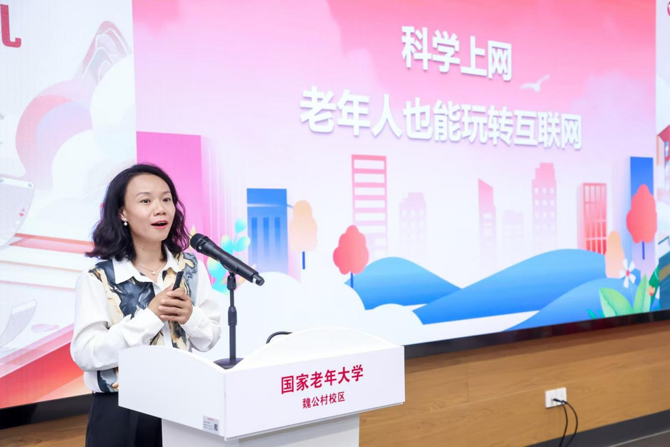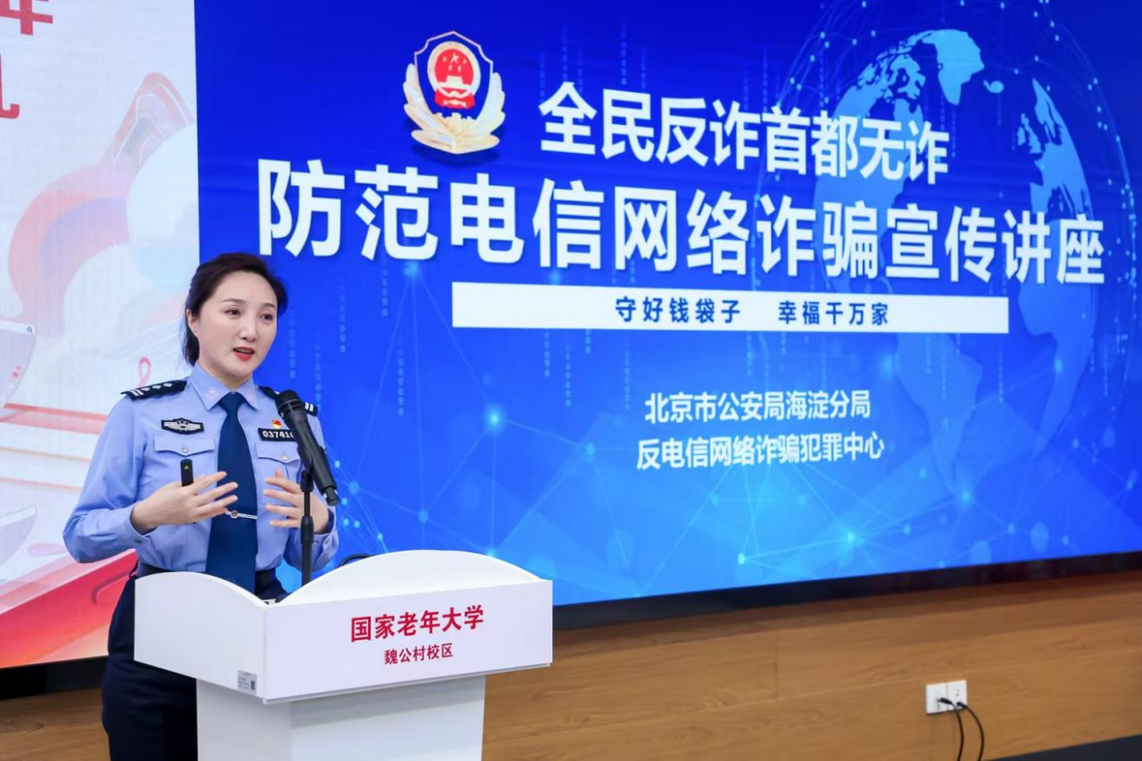 开学典礼上,中国人民大学人口与健康学院教授唐丹、北京市海淀区公安局反诈民警邹红分别以“老年人网络素养课”“最有意思的反诈课”为主题作“上课啦,老同学”公益讲座。