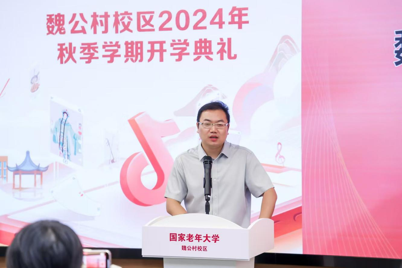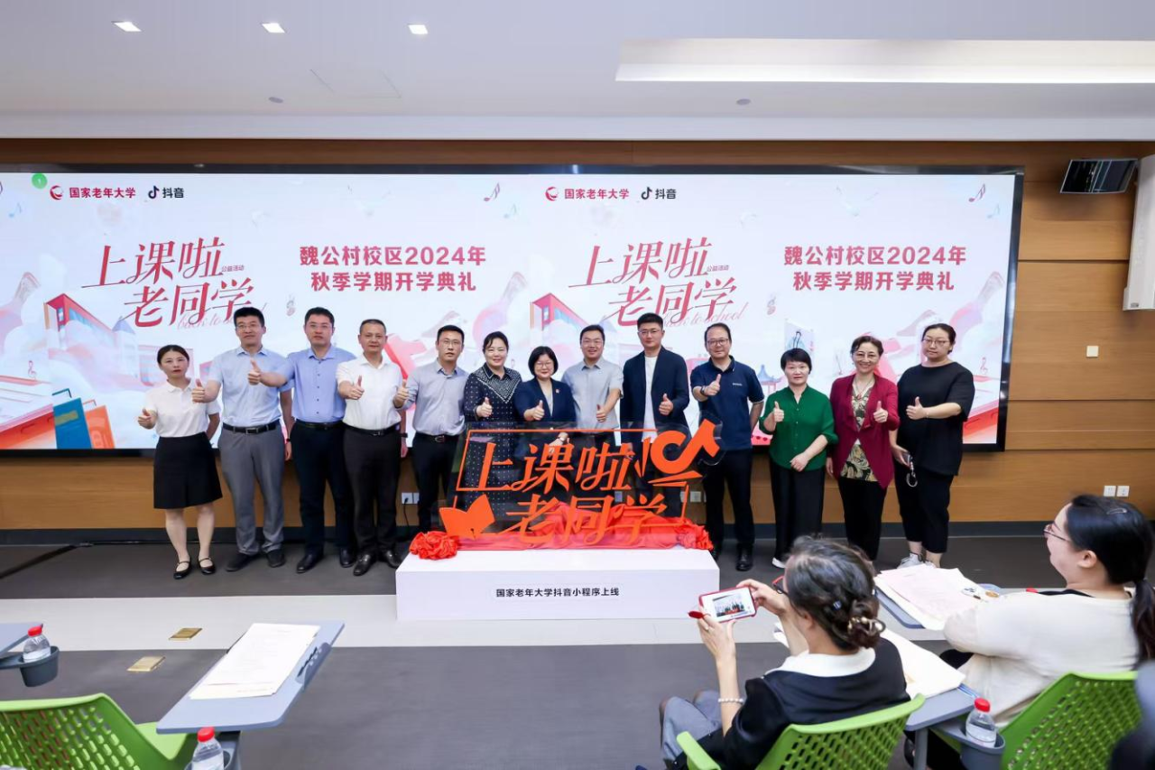 9月12日,国家老年大学魏公村校区举办2024年秋季学期开学典礼。国家开放大学(国家老年大学)党委委员、副校长范贤睿,抖音集团政务运营总经理王博出席活动,共同启动“上课啦,老同学”公益活动。抖音集团相关业务负责人,国家开放大学外语学院、中职学院、实验学院、组织部/人事处、财务处、后勤保卫处、国家老年大学各处室负责人与魏公村校区50余名师生参加活动。活动由国家老年大学直属学院院长刘彩梅主持。