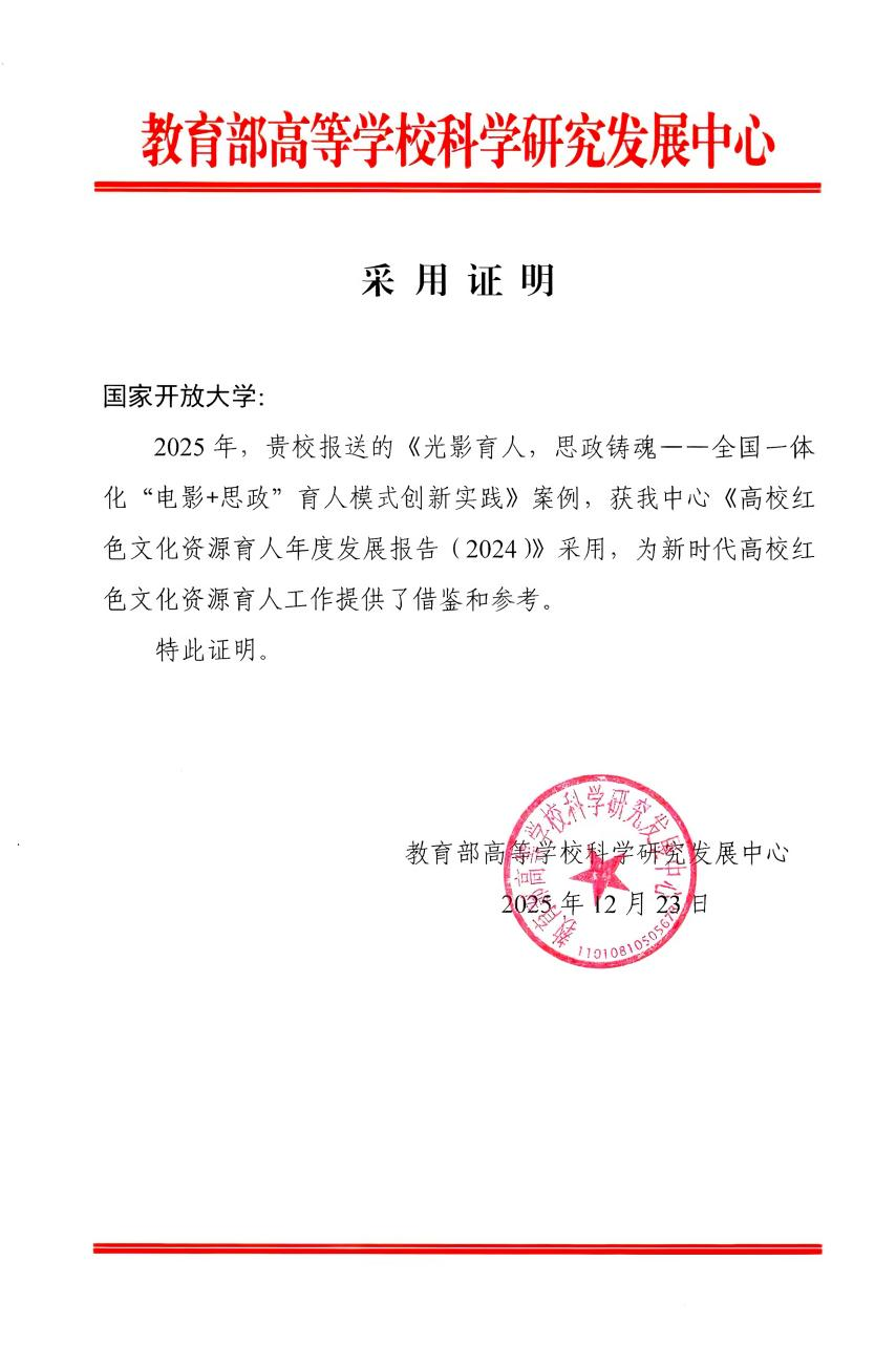 近日,国家开放大学报送的《光影育人,思政铸魂——全国一体化“电影+思政”育人模式创新实践》案例,被教育部高等学校科学研究发展中心《高校红色文化资源育人年度发展报告(2024)》采用,该案例为新时代高校红色文化资源育人工作提供了宝贵借鉴与重要参考。