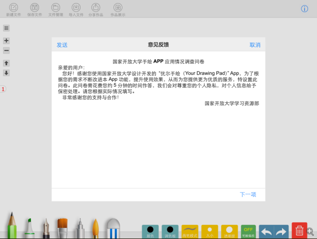 为了能够根据用户意见和需求不断改进“优尔手绘”的功能和学习体验,学习资源部设计了“国家开放大学优尔手绘APP应用情况调查问卷”,用户点击“优尔手绘”首页面右上角蓝色的