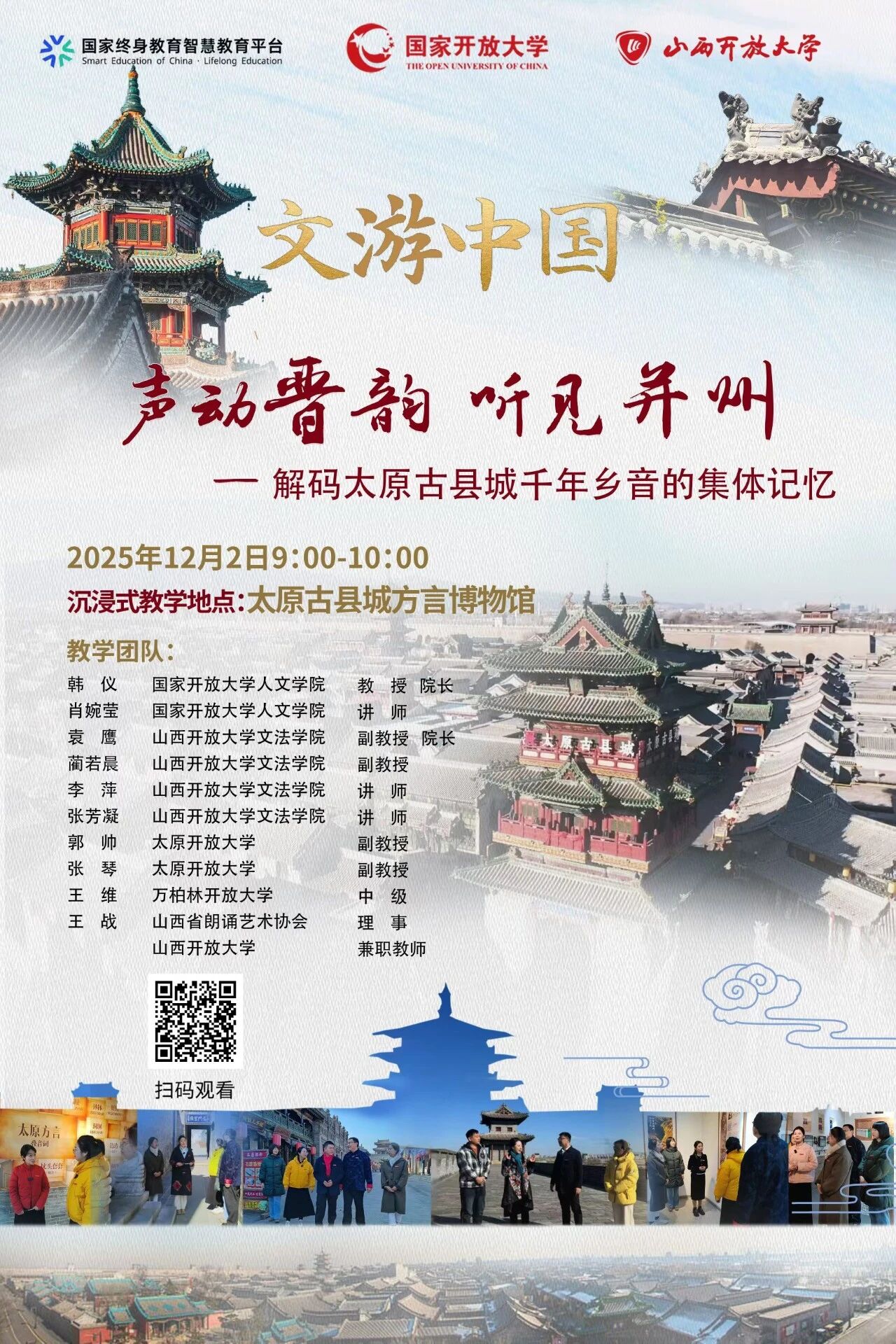 12月2日,由国家开放大学、山西开放大学、太原开放大学、万柏林开放大学教师与山西省朗诵艺术协会理事(兼职教师)共同组成的教师团队,带领大家走进太原古县城和太原方言博物馆,以“中文+传媒+文旅”的沉浸式直播方式,“一镜到底”的镜头呈现,兼及朗诵、相声、晋剧、民歌等多元表现,通过国家终身教育智慧教育平台服务各界朋友的“云”学习与“云”游,开启了一场“声动晋韵 听见并州——解码太原古县城千年乡音的集体记忆”的探“言”之旅。