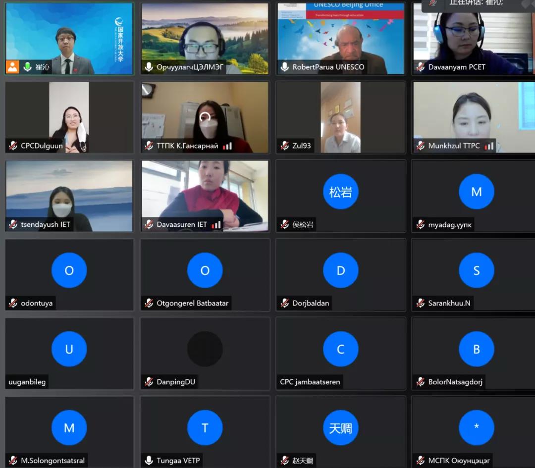 2021年12月8日至9日,国家开放大学再次应联合国教科文组织邀请开展了第三期蒙古国职业教育教师在线教学技能培训。本次培训以远程视频方式进行,来自蒙古国建筑工学院、蒙古理工工程技术学院、蒙韩理工学院、蒙古制造理工学院等4所职业院校的42名教师和技术人员全程参加了培训。本次培训是深入落实国家开放大学与联合国教科文组织2020年5月签署的合作备忘录,巩固双方合作伙伴关系的又一重要务实举措,联合国教科文组织将为本期培训提供不超过5000美元的资助。