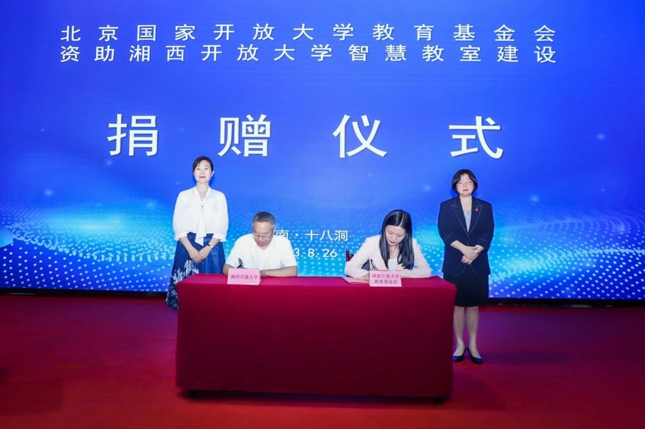 8月26日,北京国家开放大学教育基金会资助湘西开放大学智慧教室建设捐赠仪式在湖南湘西十八洞村举行。北京国家开放大学教育基金会秘书长郑洁与湘西开放大学党委书记肖明安签署了捐赠协议书。国家开放大学党委委员、副校长范贤睿及湖南开放大学党委副书记、校长杨斌共同见证。