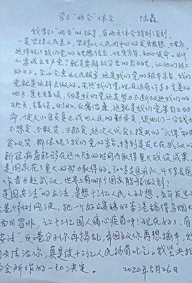 陆鑫同志一笔一划手写感想:“我通过学习两会报道,有两点体会特别深刻。一是坚持人民至上,坚持以人民为中心的发展思想、理念让我印象深刻。这体现了我们党的理想信念、性质宗旨、初心使命。这次抗疫斗争能够在这么短的时间内取得重大战疫成果,是党和国家团结一心、艰苦奋斗的结果。疫情当前,300多支医疗队,4万多名医务工作者集体奔赴武汉,两会上提出扎实做好‘六稳’工作,落实‘六保’任务,以更大决心、更强力度推进脱贫攻坚,坚决夺取脱贫攻坚战全面胜利,全面建成小康社会任务等都体现了我们党的宗旨。二是审议通过建立健全香港特别行政区维护国家安全的法律制度和执行机制的决定,是想十四亿人民之所想,保证了香港的繁荣稳定与‘一国两制’的行稳致远。我坚决拥护两会所作的一切决议。”