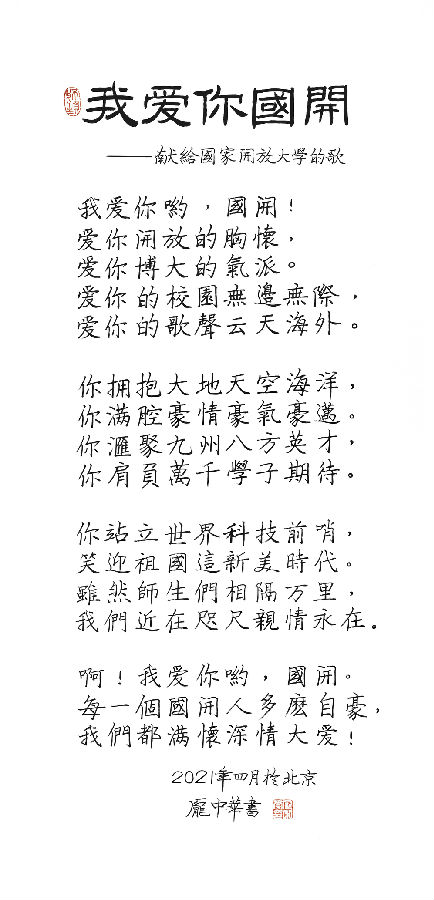 “我爱你哟,国开!爱你开放的胸襟,爱你博大的胸怀。爱你的校园无边无际,爱你的歌声云天海外……”近日,中国硬笔书法协会创会主席、硬笔书法学院院长庞中华亲笔为国家开放大学赋诗一首,题为《我爱你国开——献给国家开放大学的歌》。