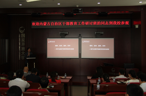 继中组部全国干部网络培训专题研讨班将课堂搬到国家开放大学之后,2014年9月26日,内蒙古自治区干部教育工作研讨班学员一行50人也来到国家开放大学开展现场教学。国家开放大学党委副书记张少刚在海南通过云教室系统,组织国家开放大学总部9个部门为内蒙古和海南两地干部教育工作者安排了一场远程协同教学活动。