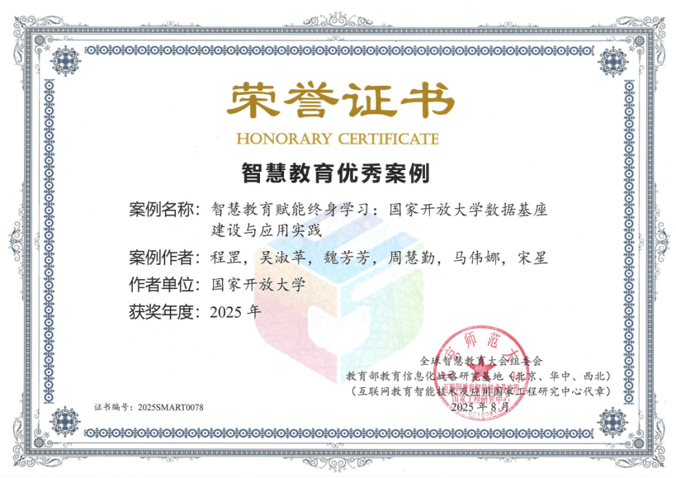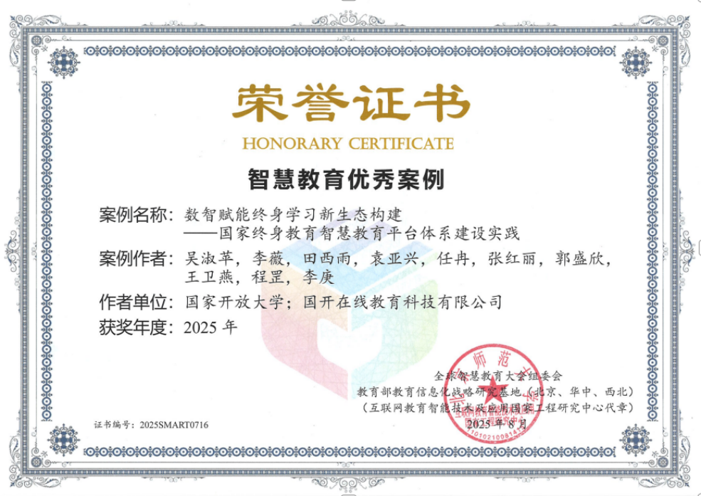 为纵深推进教育数字化战略行动,促进智慧教育领域经验互学互鉴,教育部科学技术与信息化司指导全球智慧教育大会组委会开展“2025年度智慧教育优秀案例征集”活动。近日,国家开放大学提交的“智慧教育赋能终身学习:国家开放大学数据基座建设与应用实践”“数智赋能终身学习新生态构建——国家终身教育智慧教育平台体系建设实践”两项案例成功入选,展现了学校在智慧教育领域的创新探索与实践成效。