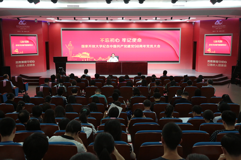 为庆祝中国共产党成立98周年,7月1日上午,国家开放大学在五棵松总部举行“不忘初心、牢记使命”庆祝中国共产党成立98周年党员大会暨主题演讲比赛。党委书记、校长杨志坚同志为全校党员干部上专题党课。校领导班子成员、全体党员和部分青年教职工近400人参加会议。