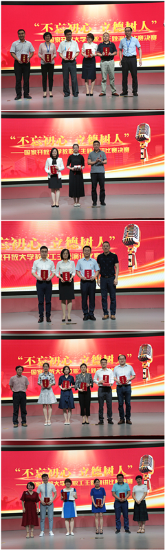 “不忘初心、立德树人”国家开放大学教职工主题演讲比赛是我校落实立德树人根本任务,加强和改进教师思想政治工作,切实增强师德师风建设的重要载体之一,也是校庆活动和“不忘初心、牢记使命”主题教育的重要组成部分。决赛环节中,选手们围绕主题,尽展风采,以饱满的热情抒发了对各自岗位、对国家开放大学和对党无限的热爱。