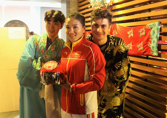 其中,学生们对中华文化体验中心的各项展示尤其感兴趣。有的围在交互电子屏幕前,兴致勃勃地用毛笔书写自己的名字;有的体验编钟敲击,和兵马俑模型合影,有的试穿京剧服饰,向老师们了解京剧里的基本角色。来自韩国的权五綎和罗马尼亚的高杨格外幸运,当他们试穿京剧服饰时,场地自行车团体竞速赛奥运会冠军宫金杰走了过来和学生们热情地交流,告诉学生她比赛时所戴头盔的设计灵感也来源于京剧,形象是中国历史上赫赫有名的巾帼英雄穆桂英。有机会近距离一睹中国奥运冠军风采,两位学生表示太幸福了。