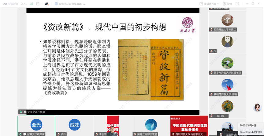 为深入学习贯彻党的二十大和二十届历次全会精神,坚持思政课建设与党的创新理论武装同步推进,不断推进党的最新理论成果融入思政课堂,持续提升国家开放大学办学体系思政课教师教学水平和教学支持服务质量,近日,国家开放大学马克思主义学院面向办学体系思政课教师开展“中国近现代史纲要”课程集体备课活动。南开大学马克思主义学院教授、博士生导师,教育部高等学校思想政治理论课教学指导委员会“中国近现代史纲要”分教学指导委员会副主任委员纪亚光担任主讲专家。此次活动采取“线上+线下”相结合的方式,来自办学体系的480多名思政课教师参加活动。国家开放大学马克思主义学院副院长陈鲲主持活动。
