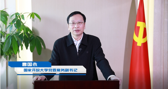 曹国永代表国家开放大学党委向所有为抗击疫情付出辛勤劳动和不懈坚守的全体国开人和国开青年致以崇高的敬意。他表示,在疫情防控期间,国家开放大学多措并举,体系联动,迅速开展疫情防控各项工作;守望相助,全力支持湖北、武汉等地一线防控;充分发挥“互联网+教育”优势,在助力“停课不停学”等方面做了大量有成效的工作,受到社会广泛关注。展现了国开人和国开青年讲政治、顾大局,讲奉献、能战斗的精神风貌。他鼓励国开青年深刻领会总书记回信的丰富内涵和精神实质,牢记总书记的嘱托,在为人民服务中茁壮成长,在艰苦奋斗中砥砺意志品质,在实践中增长工作本领,努力成为堪当大任的时代新人。