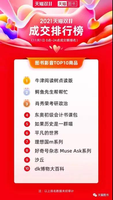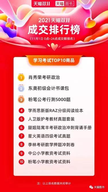 据天猫图书公众号11月2日新鲜出炉的开门红首日活动战报,学习考试TOP10成交商品排行榜中,“肖秀荣考研政治”拔得魁首。