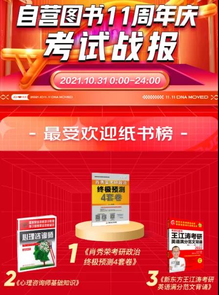 京东也在同日发布了自营图书11周年庆考试战报,《肖秀荣考研政治终极预测4套卷》雄踞最受欢迎纸书榜榜首!于2021年6月上市的《肖秀荣考研政治1000题》位列第7。