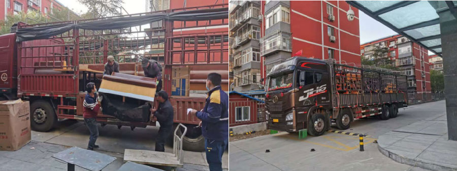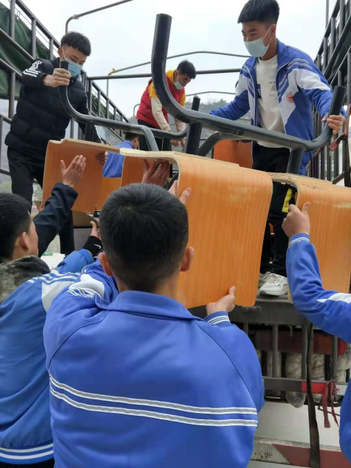 餐桌运抵王坝镇农业中学,学生帮助搬运餐桌椅