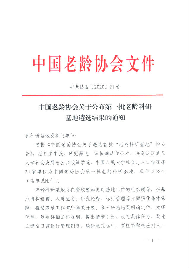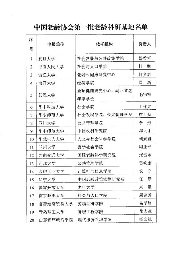 为贯彻落实党中央、国务院积极应对人口老龄化的战略部署,加强老龄事业和产业发展的重大基础理论和政策实践问题研究,中国老龄协会于2019年10月发布通知,在全国遴选建立一批“老龄科研基地”。协会依据《老龄科研基地认定和管理办法(试行)》的规定,选取支撑学科门类较为齐全、有实体性研究机构和专职研究人员、有一定研究成果积累和经费保障的高校、科研院所和党校(行政学院)。经过为期半年的自主申报、研究筛选、审核确认和公示,最终确定了首批20家老龄科研基地。协会将为基地授牌,委托研究课题、承办相关学术活动并提供一定经费,基地研究成果将报送有关部委或全国老龄委领导,作为老龄问题的决策参考。
