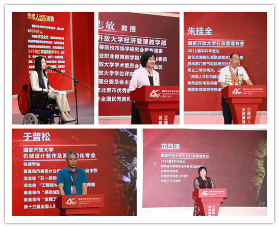 国家开放大学经济管理教学部刘志敏教授,国家开放大学2011届农村行政管理专业专科毕业生、2014届行政管理专业本科毕业生全国三八红旗手龙四清,国家开放大学2011届行政管理专业本科毕业生、2005感动青岛十佳人物朱桂全,国家开放大学2015届工商行政管理专业本科毕业生、中国青年“五四”奖章获得者董明,2017级国家开放大学河北分部秦皇岛分校机械设计制作极其自动化专业学生,第十三届全国人民代表大会代表于普松等分别作为教师代表、毕业生代表和在校生代表发言。
