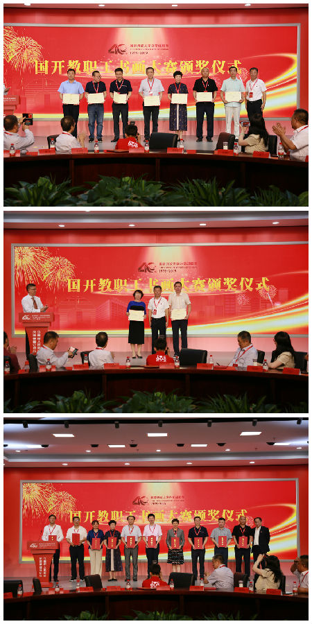 下午,大会举行了“多语通学习平台”开通仪式和纪念国家开放大学建校40周年丛书发布会。会议为招生创意微视频大赛和“弹指四十年,芳华满人间”办学体系教职工书画大赛进行了颁奖,荣获招生创意微视频大赛一等奖的上海分部、武汉分部、四川分部等3个分部,二等奖8个分部、三等奖15个分部、优秀奖25个分部,最具人气奖5个分部以及最佳组织奖8个分部代表领取了荣誉证书。“弹指四十年,芳华满人间”办学体系教职工书画大赛评选出特等奖2名,一等奖10名,二等奖20名,三等奖60名,另有47幅参赛书画作品获得提名奖,12家单位获得组织奖。杨志坚校长为特等奖、一等奖获奖者所在单位,以及荣获组织奖的12家分部代表颁发了证书。
