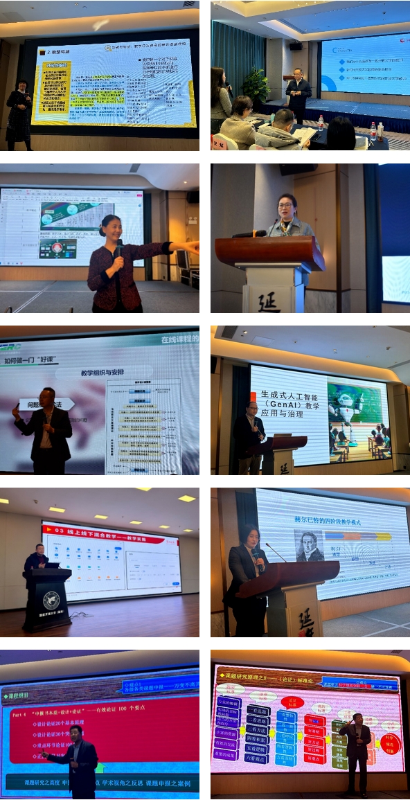 培训以“理论教学+案例分析+实践工作坊+成果汇聚”为基本思路进行设计,辅以专家现场诊断、案例分析、问题解决等培训形式。在6天时间里,邀请来自全国知名高等学校、国家级教育科学研究机构和国家开放大学办学体系的主讲教师作了《“三融”背景下教师专业发展路径分析》《从<国家开放大学综合改革方案>看新时代开放大学教师的使命担当》《课程思政教学体系构建及思政元素挖掘与融入》《基于虚拟教研室的创新教学团队建设》《生成式人工智能(GenAI)教学应用与治理》《国家在线精品课程设计、案例解析与指导》《基于设计的教学模式创新与成果提炼》《数字化转型与线上线下混合式教学》《有效课题研究的100条策略与方法》等9个专题内容的讲授。结合授课主题,主讲专家对多年的教学、实践和研究成果进行高度凝练,认真授课,悉心指导,授之以渔。