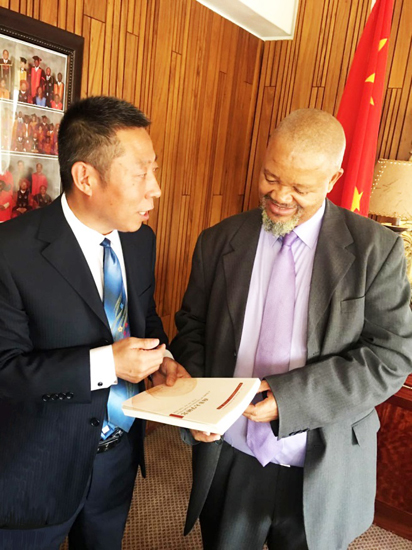 刘臣副校长向南非大学校长Mandla Makhanya赠送国家开放大学出版的《南非大学研究》一书