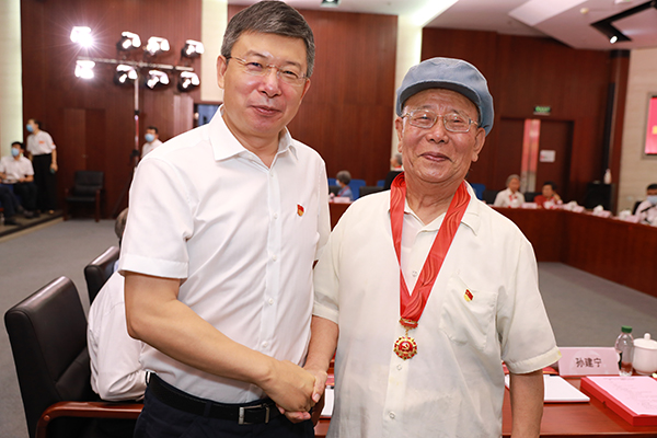 荆德刚为老同志代表颁发“光荣在党50年”纪念章。高聚慧、荆德刚向获得表彰的个人和单位代表颁奖。“光荣在党50年”代表孙美春,优秀党务工作者代表、农林医药教学部党支部书记李广德,优秀共产党员代表、教育教学部教师王宇分别在会上发言。