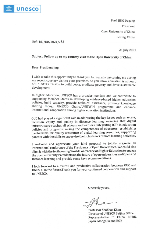 2021年7月8日,联合国教科文组织新任驻华代表夏泽翰教授一行访问国家开放大学,对学校在新冠肺炎疫情前后利用现代信息技术手段实现教育公平所取得的成就表示高度赞赏。7月21日,夏泽翰教授专门致函党委书记、校长荆德刚,再次表达了他对国家开放大学在开放远程教育领域所取得的成绩的高度认可与充分肯定。