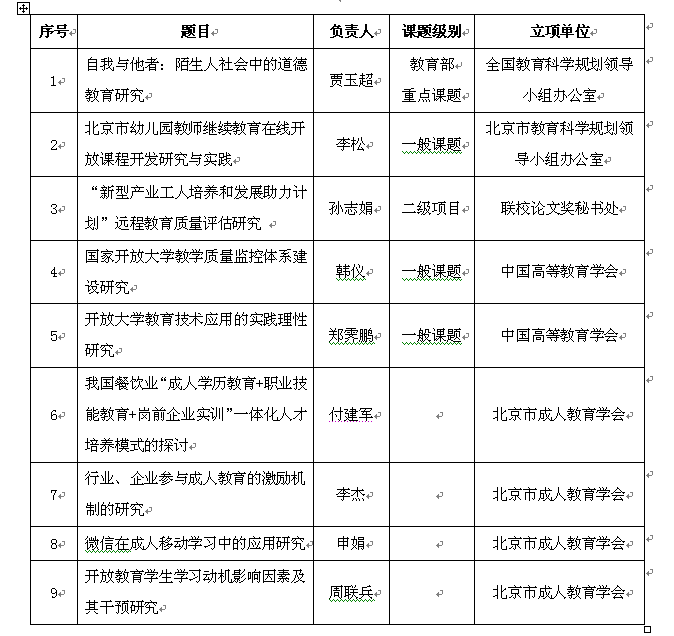 近期,全国教育科学规划领导小组办公室、北京市教育科学规划领导小组办公室、“联校论文奖计划”秘书处、中国高等教育学会、北京市成人教育学会等单位分别公布了本年度优秀科研成果评选和科研课题立项结果,国家开放大学教师刘志敏的科研成果《国家开放大学全过程学习支持服务研究》获得北京市成人教育学会优秀科研成果评选一等奖,贾玉超的课题《自我与他者:陌生人社会中的道德教育研究》获得全国教育科学规划领导小组办公室立项且为教育部重点课题。此外,国家开放大学还有多位老师的科研成果、课题获奖、立项,国家开放大学获得北京市成人教育学会科研成果评选优秀组织奖。
