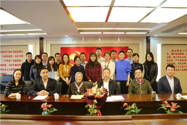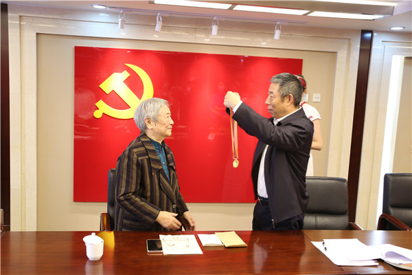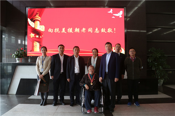 党委副书记刘臣为参加抗美援朝出国作战的老同志、原中央广播电视大学副校长陆鑫颁发“中国人民志愿军抗美援朝出国作战70周年”纪念章。陆鑫与青年教职工座谈,为大家讲述了抗美援朝的革命故事。