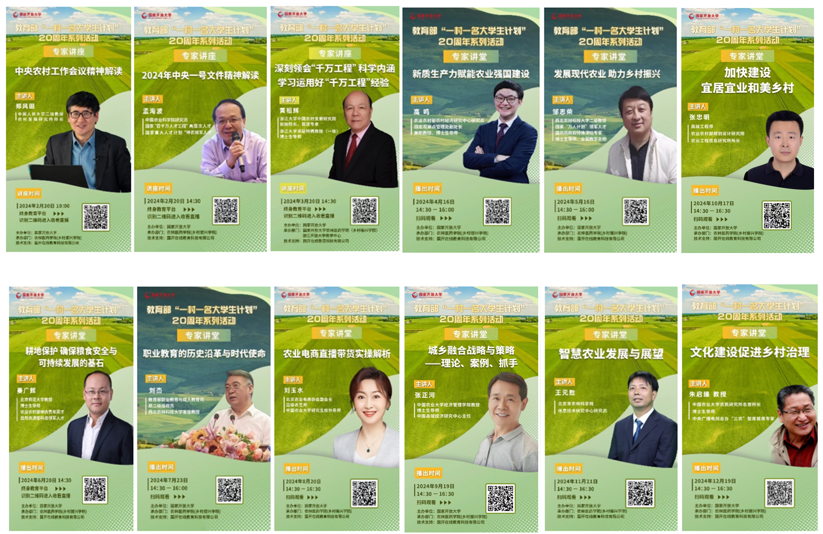 乡村要振兴,人才必振兴。习近平总书记强调:“激励各类人才在农村广阔天地大施所能、大展才华、大显身手,打造一支强大的乡村振兴人才队伍”。为开阔思路、启迪智慧、集思广益,共谋乡村本土人才培养及服务乡村全面振兴良策,2024年,国家开放大学举办了教育部“一村一名大学生计划”20周年系列活动之专家讲堂,邀请“三农”领域权威专家开展交流分享。