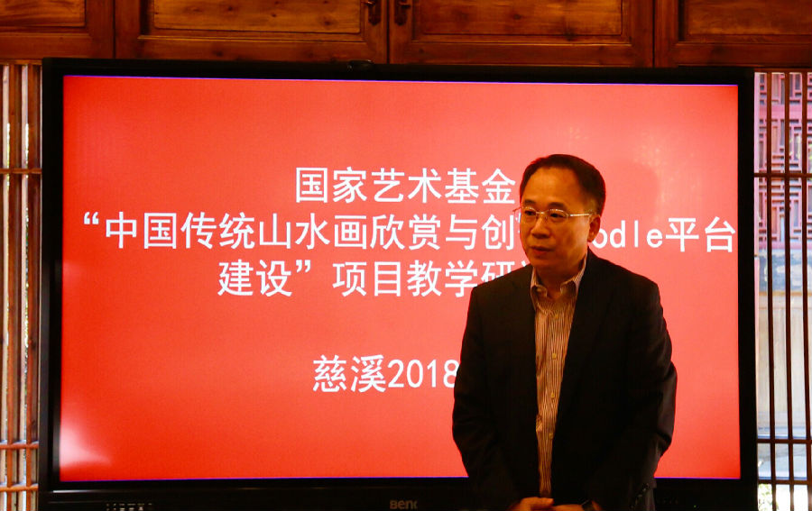 2018年4月8日,国家开放大学中国传统山水画欣赏与创作MOODLE平台建设项目研讨会在浙江省慈溪市召开,国家开放大学校长杨志坚,项目组成员,及部分分部校领导共17人参会。研讨会由项目组负责人唐应山主持。