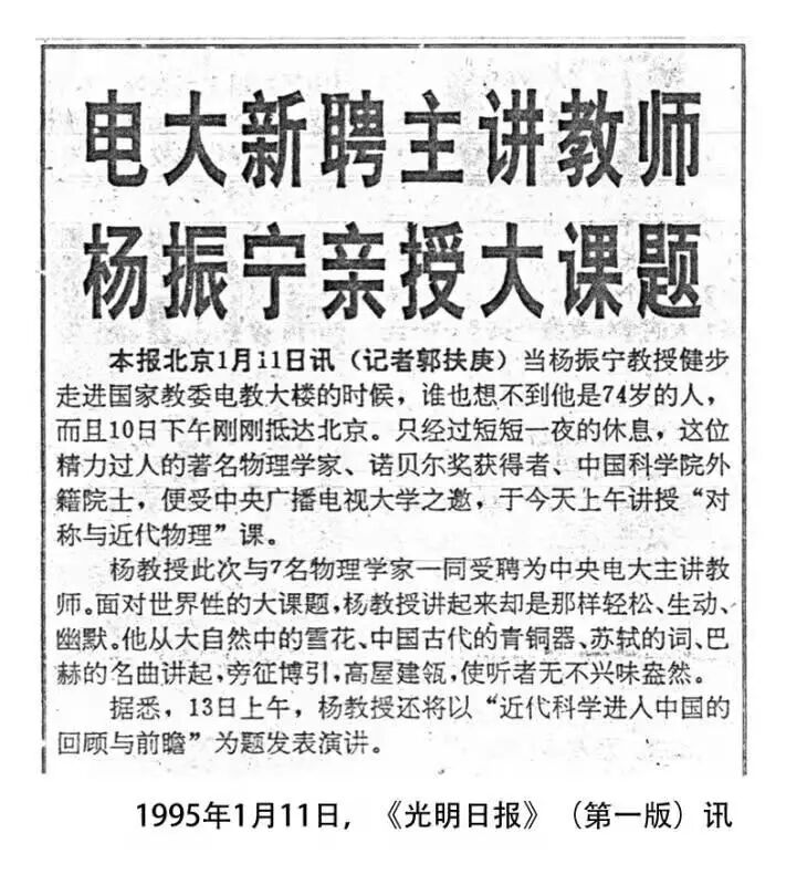 1995年1月11日,受聘担任电大主讲教师的杨振宁教授专程从纽约赶来,前往新迁进国家教委电教大楼的中央电大,发表了题为《对称与近代物理》的演讲。杨教授从远古人类对雪花的观察讲起,又通过苏轼的回文诗、巴赫的小提琴二重奏及伊斯兰史建筑等人类的文化、科技成果,深入浅出地阐述了“对称与守恒定律的关系”这一20世纪物理学的中心思想。1月13日,杨教授又以《近代科学进入中国的回顾与前瞻》为题发表演讲,演讲文稿收入电大《大学物理》教材,演讲录像作为电大视听教材在全国播放。
