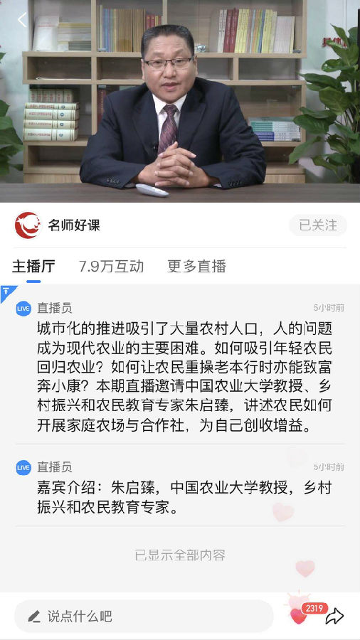 策划阶段,团队与专家反复研讨、协商,最终确定既契合我国农业发展面临的新形势新挑战,又能够满足专业教育和课程需要,同时适合社会大众观看的主题和内容。直播课程每周推送两集,向公众介绍了关于“如何拒绝粮食浪费”“农民如何增益创收”“疫情、极端天气与资源紧缺对粮食安全的影响”“疫情期间如何保障饮食安全与营养健康”等知识。
