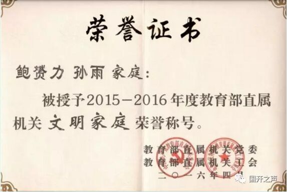 在国家开放大学这个大家庭里,有不少为学校发展而努力拼搏的小家庭,鲍赟力和孙雨的家就是其中一个。在2016年教育部文明家庭评选活动中,鲍赟力和孙雨这个小家庭被授予教育部“文明家庭”荣誉称号。荣誉的获得不仅是对小家庭的肯定和鼓励,更是对满满正能量的国家开放大学这个大家庭的认可和赞誉。