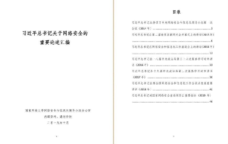 宣传周期间,全校教职工通过OA系统下载学习《习近平总书记关于网络安全工作重要论述汇编》。该汇编收录了7篇习近平总书记在2014年2月27日至2019年9月17日期间关于网络安全和信息化方面的重要讲话、指示等。