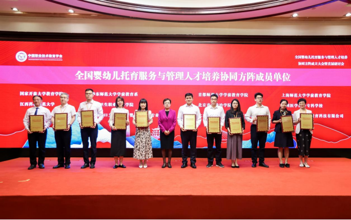 在方阵成立仪式上,国家开放大学教育学院、华东师范大学学前教育系、首都师范大学学前教育学院、宁波卫生职业技术学院等29家单位正式成为全国首批方阵成员。中国职业技术教育学会会长、教育部原副部长鲁昕出席大会,并为成员单位颁发了“全国婴幼儿托育服务与管理人才培养协同方阵成员单位”牌匾。