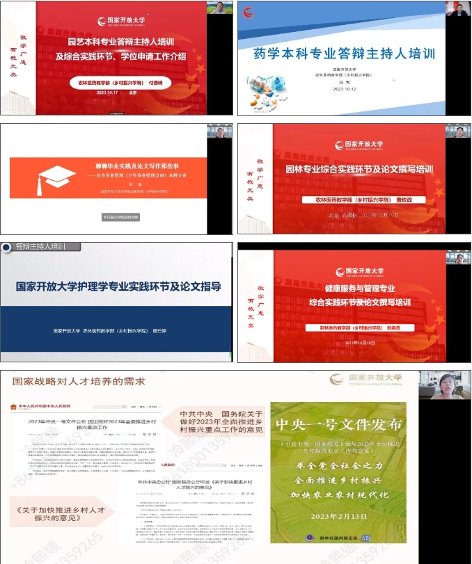 为全面学习贯彻党的二十大精神,落实《国家开放大学2023年工作要点》,加强办学体系农医类专业教师队伍建设,提升学生毕业论文指导和答辩工作水平,提高教学质量,国家开放大学农林医药教学部(乡村振兴学院)于9月至10月举办了农医科类本科专业答辩主持人线上培训。培训重点围绕农医类专业毕业综合实践环节及学位授予相关要求,毕业论文和学位论文选题、撰写及答辩要求,以及答辩主持人的任务与要求等内容开展,培训形式主要包括专家讲座、专业培训和分享交流等。来自总部和36个分部(学院)的184名教师参加。综合资格审查结果、作业及学习完成情况,共162人次获得答辩主持人证书。即将开展毕业综合实践和毕业论文写作的相关专业学生也参加了此次培训。208人次观看直播培训,458人次回看培训视频。