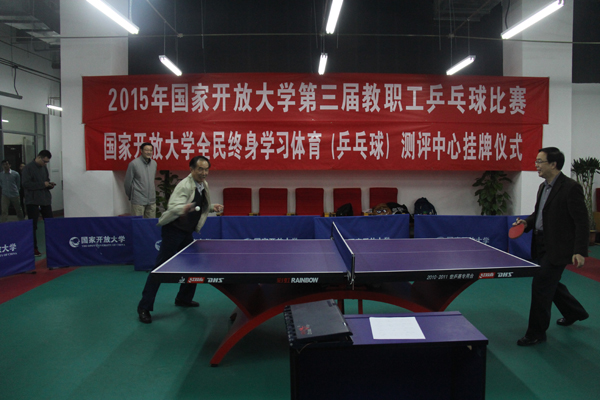 王蒲、张少刚先后致辞并为2015年国家开放大学教职工乒乓球赛决赛开球。按照积分办法,获得本次比赛冠亚军的男女选手会获得一段积分。