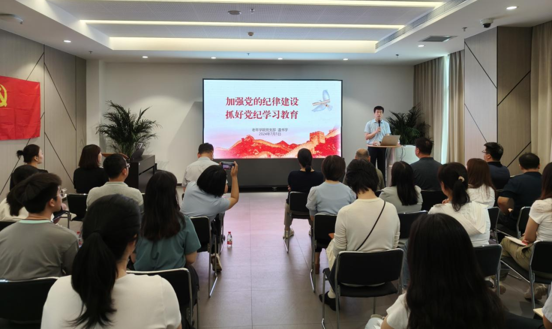 老年学院党支部书记温书宇以“加强党的纪律建设,抓好党纪学习教育”为主题讲授党课。他围绕理论、实践等方面阐述了加强党的纪律建设的重要性和紧迫性,领学了《习近平关于全面加强党的纪律建设论述摘编》的部分内容,重点讲解了《中国共产党纪律处分条例》总则和分则的具体内容。