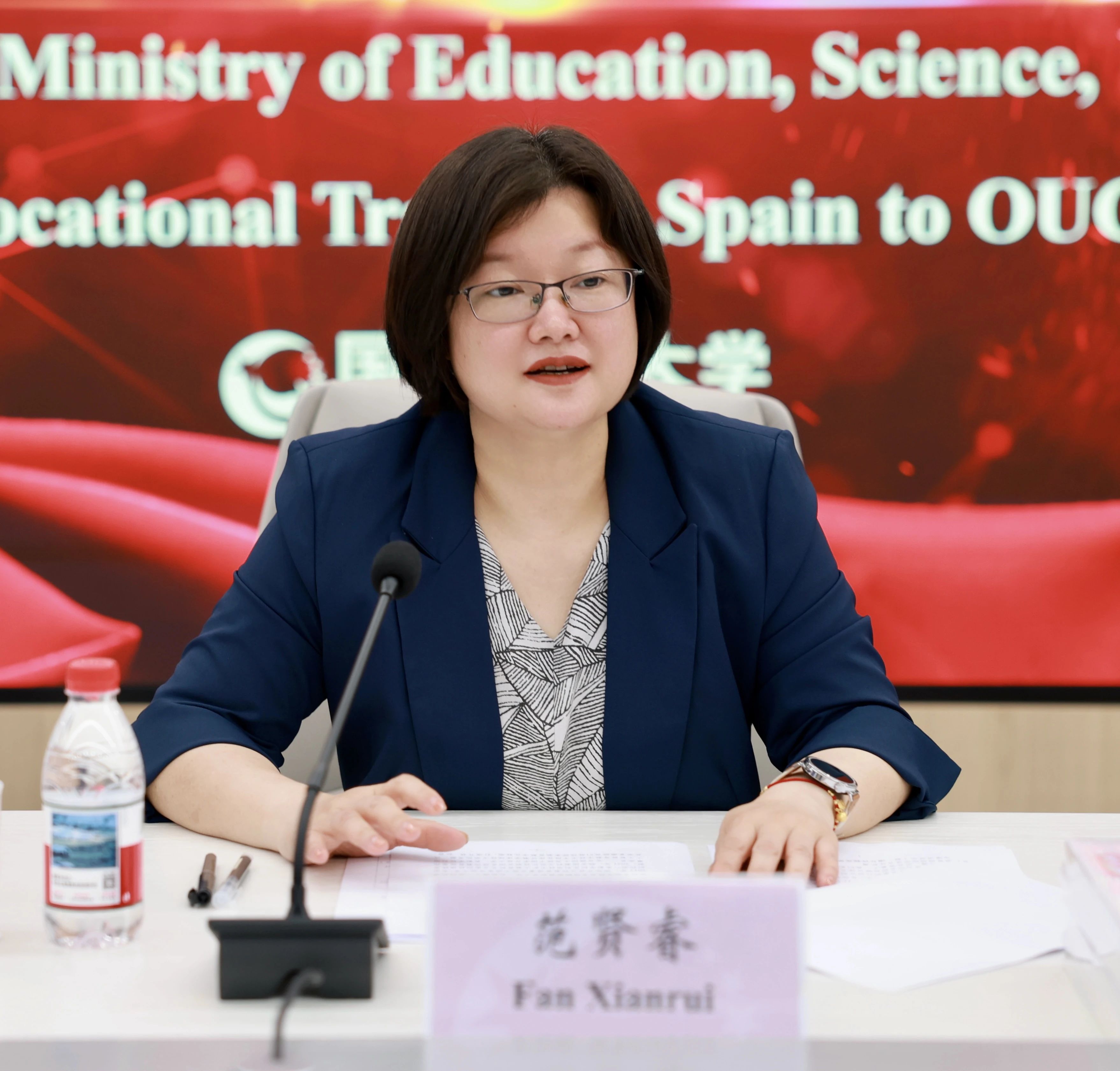 范贤睿对代表团的到来表示热烈欢迎。她介绍了国家开放大学(国家老年大学)的发展历程和办学特色,以及与西班牙高校及机构的合作情况,并希望双方以此次访问为契机,深化友好交往,建立长效合作机制,不断加强在数字教育和人工智能应用领域的交流与合作,共同推动教育数字化转型,为两国教育合作和人文交流搭建更加坚实的桥梁。