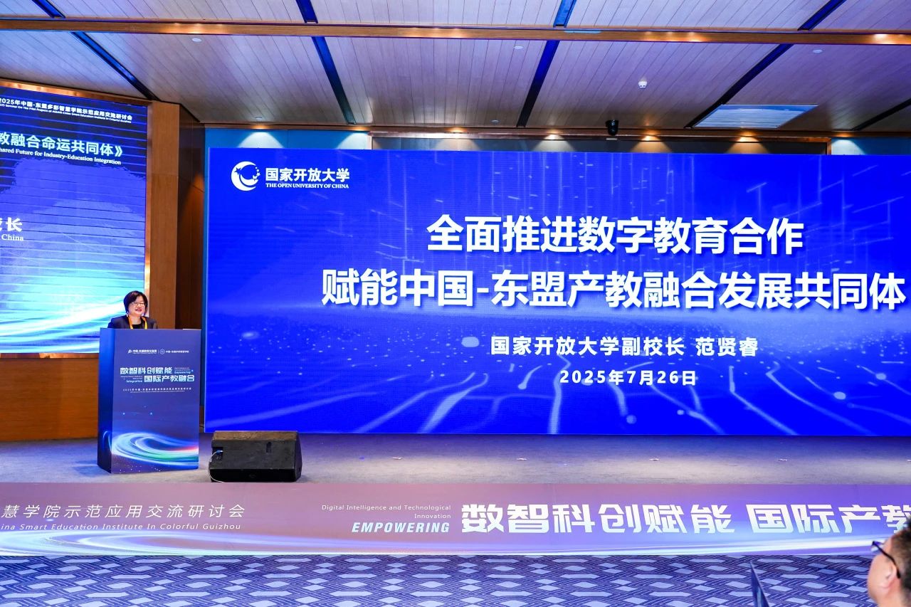 7月26日下午,由中国—东盟教育交流周组委会秘书处主办的“数智科创赋能·国际产教融合”——2025年中国—东盟多彩智慧学院示范应用交流研讨会举行。范贤睿出席活动并作主旨发言。范贤睿以“全面推进数字教育合作 赋能中国—东盟产教融合发展共同体”为主题,介绍了国家开放大学自2023年担任中国—东盟数字教育联盟(以下简称“联盟”)秘书处以来,在推动中国与东盟国家数字教育合作方面的实践及成果。她表示,联盟成员单位将继续深化数字教育合作研究,构建优质资源共建共享体系,推进区域数字教育标准协同,提升数字教育能力,赋能人才终身发展。