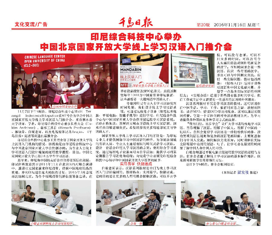 近日,印尼综合科技中心Multi Terampil Indonesia在Krputran街举办了国家开放大学线上学习汉语入门推介会,《千岛日报》记者应邀参加会议,并对印度尼西亚推广MyEChinese情况做了详细报道(全文附后)。