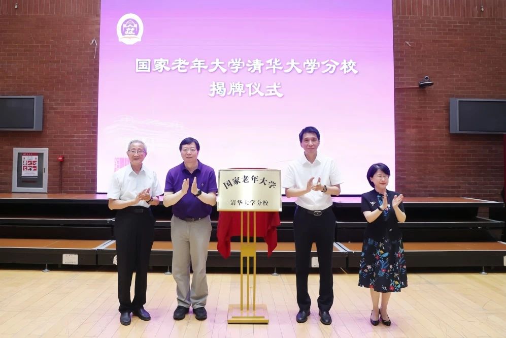 邱勇、于虹、王启明、胡显章共同为国家老年大学清华大学分校揭牌。