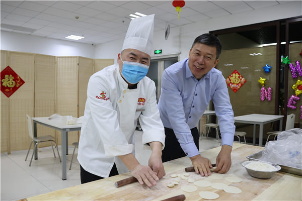 2月8日,党委书记、校长荆德刚和学校食堂工作人员为教职工包饺子。