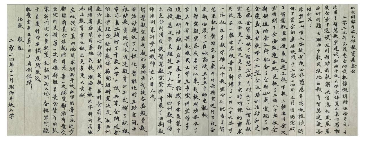 湘西开放大学赠送国家开放大学教育基金会手写感谢信