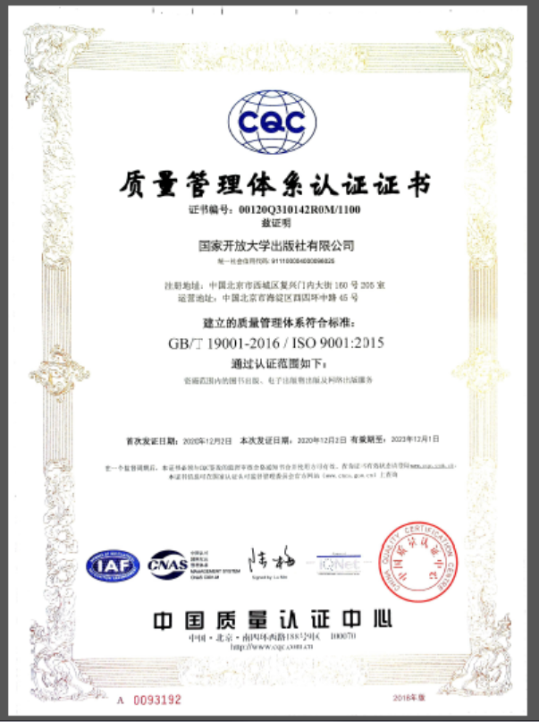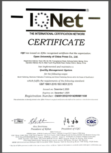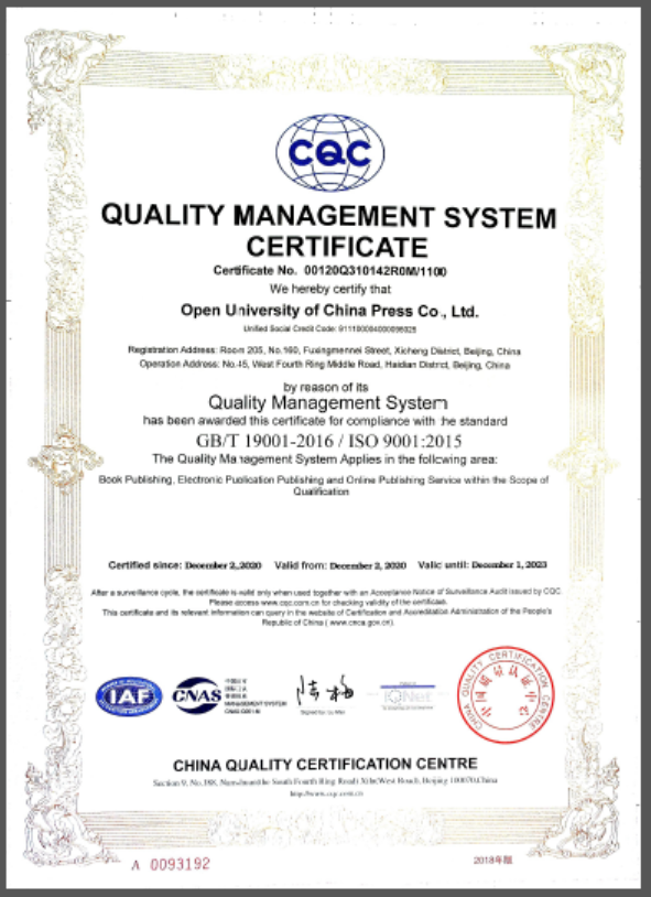 国开出版社建社近40年来,始终坚持为人民服务、为社会主义服务的出版方针,始终坚持为国家开放大学教学和科研服务的办社宗旨,构建服务终身学习的发展格局,积极服务于国家开放大学“创优提质”战略,迈向“以质图强”新征程,聚焦优质教材出版,不断创新教材出版工作机制,认真推进精品出版战略,出版了一大批优质出版物特别是精品教材。2020年12月,国开出版社通过了中国质量认证中心的专项审核,获得ISO 9001质量管理体系认证证书,标志着国开出版社步入了规范化、标准化、科学化的高质量管理轨道。