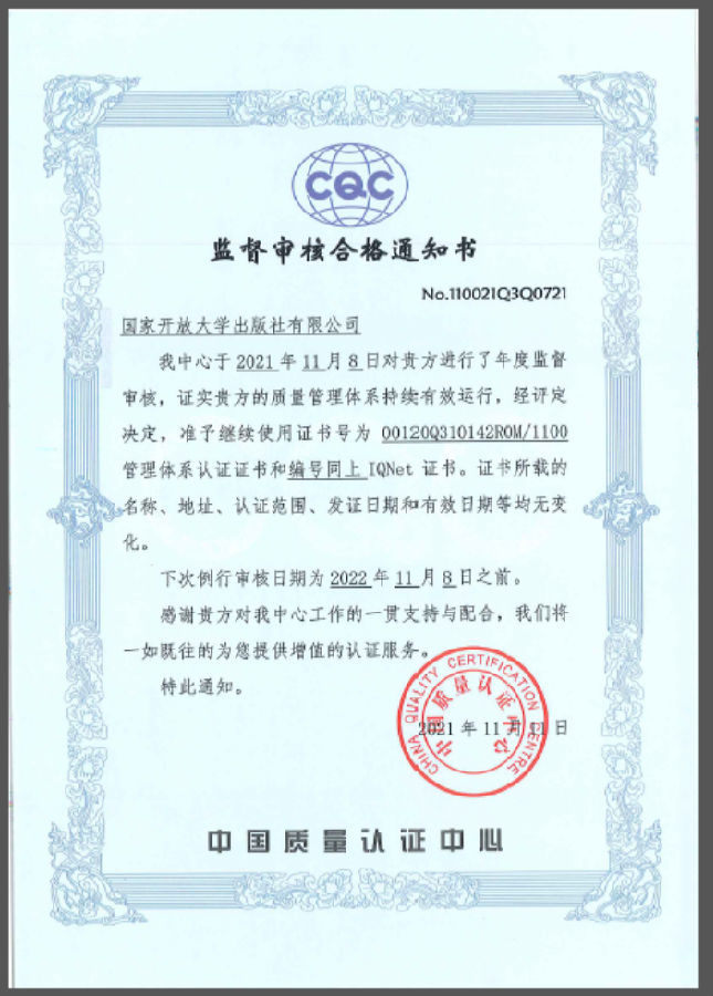 2021年11月,中国质量认证中心审核专家组对国家开放大学出版社有限公司(以下简称国开出版社)进行质量管理体系年度监督审核。本次审核内容包括《国家开放大学出版社有限公司质量手册》《国家开放大学出版社有限公司程序文件》等质量管理文件共357个。审核专家组认为,国开出版社制度建设完善,质量管理体系运行良好且有效,提交材料完备,无体系标准不符合项,顺利通过年度审核,同时对国开出版社的质量管理和标准贯彻工作给予高度肯定。